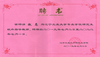 | 我公司趙恩、翁鐵生被遼寧工業(yè)大學(xué)研究生學(xué)院聘為遼寧工業(yè)大學(xué)專(zhuān)業(yè)學(xué)位研究生校外指導(dǎo)教師。 |